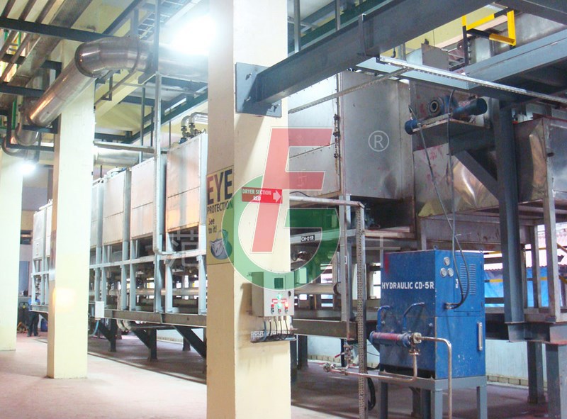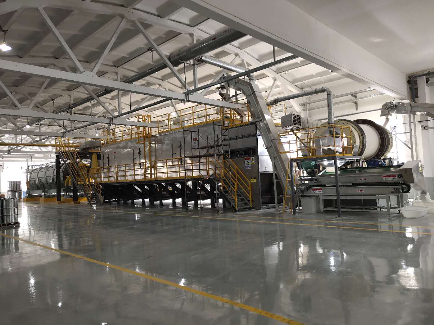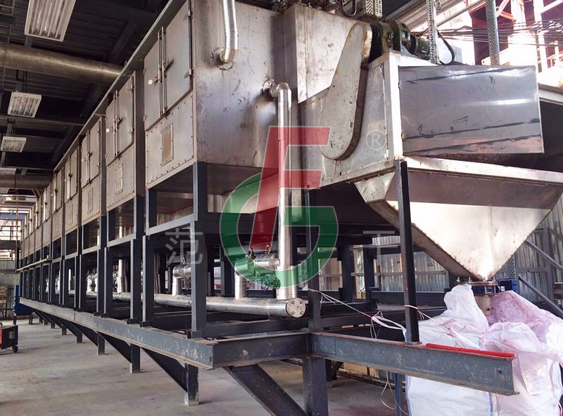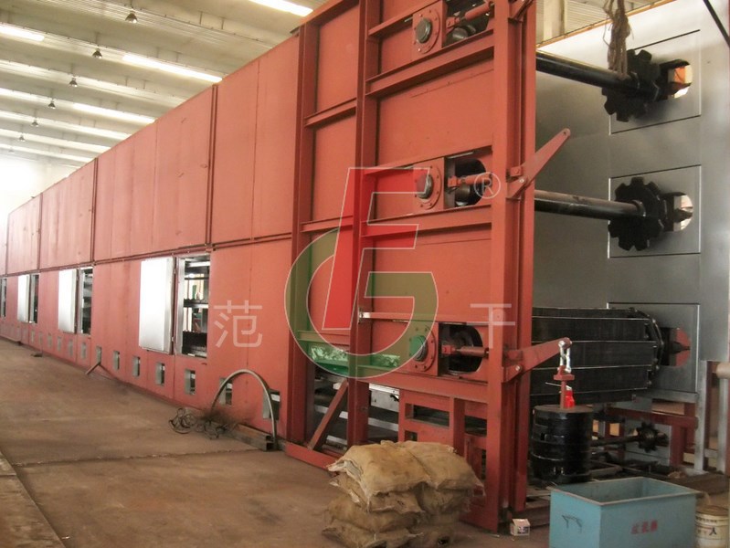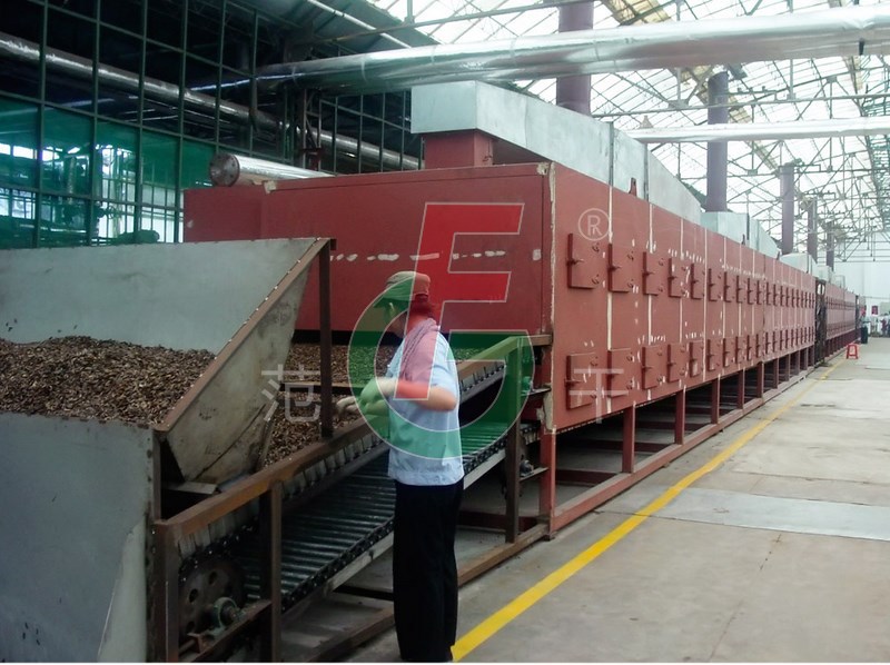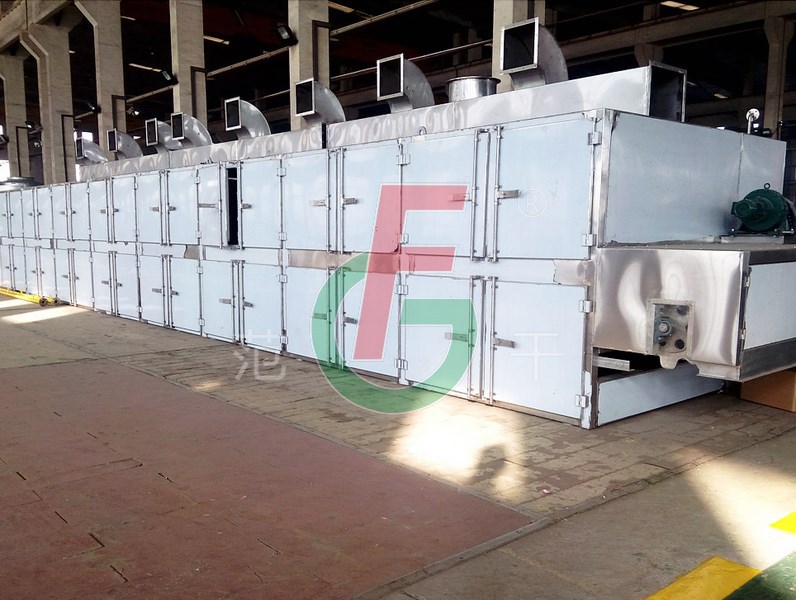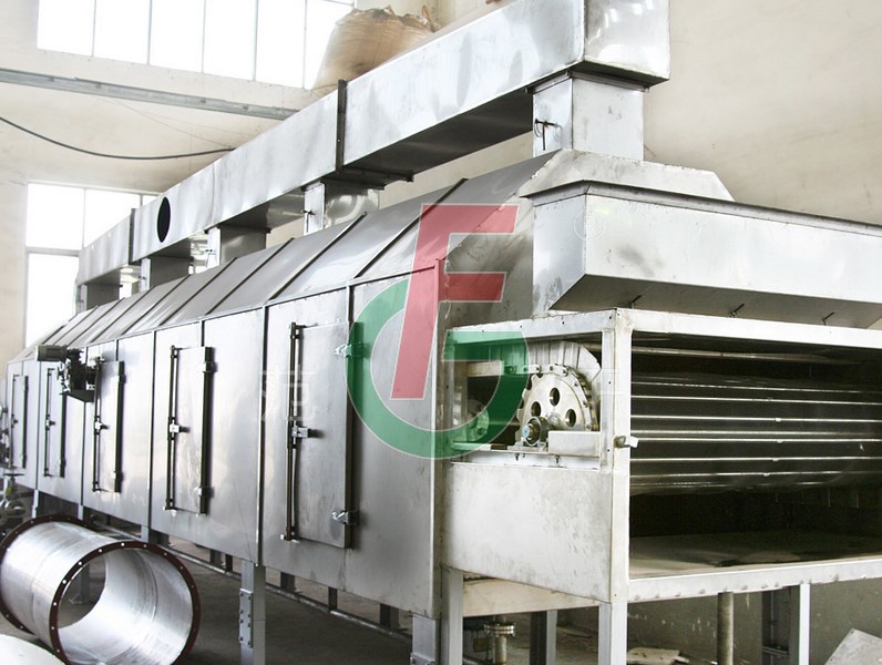 將需要處理的物料通過適當(dāng)?shù)牟剂蠙C構(gòu),如星型布料機、擺動帶、粉碎機或造粒機,分布在輸送帶上,輸送帶通過一個或幾個加熱單元組成的通道,每個加熱單元均配有空氣加熱和循環(huán)系統(tǒng),每一個通道有一個或幾個排濕系統(tǒng),在輸送帶通過時,熱空氣從上往下或從下往上通過輸送帶上的物料,從而使物料能均勻干燥。