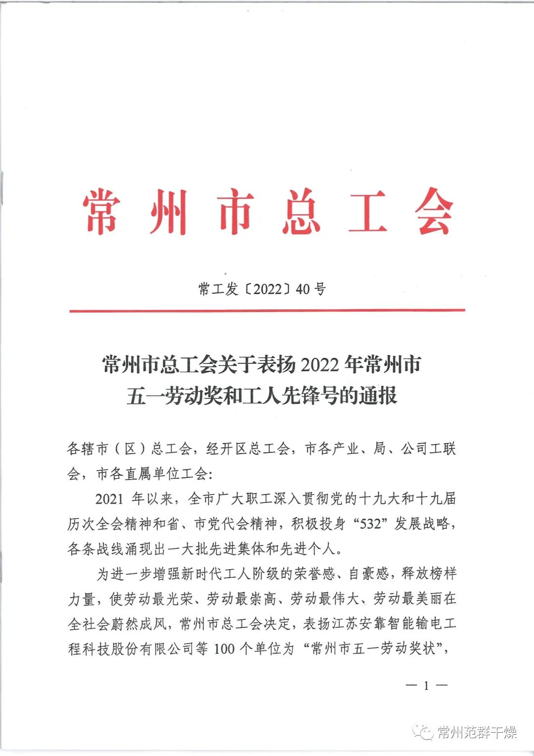 “常州市五一勞動獎和工人先鋒號”是常州市總工會授予企事業單位的最高榮譽。常州范群將化榮譽為動力,以獎狀為任務,不忘初心、牢記使命,開拓奮進、攻堅克難,實現疫情防控和生產經營“雙戰雙勝”等各項工作。