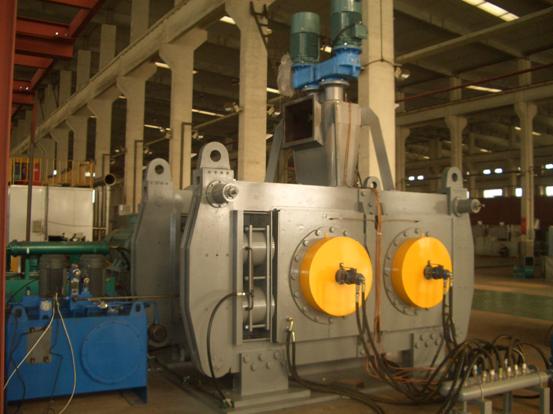 該對輥式壓片造粒機由機架組件,壓輥組件,傳動裝置,液壓緩沖組件及喂料機五部分組成.其工作原理為: 該機利用成對壓輥,彼此留有一定間隙,采用同步控制器控制兩臺電機和減速機,使對輥同步且相向運轉。其中一組對輥軸座固定,另一組對輥軸座滑動,藉助液壓缸施壓彼此緊靠,同時液壓系統還起補償作用。壓輥表面有規(guī)則地排列許多形狀、大小相同的穴孔(弧槽),根據物料對象壓縮比的不同,選擇采用一壓輥穴孔的波谷正好對準另一壓輥的波谷或波峰對準波谷。兩壓輥呈水平布置,粉粒狀物料從兩壓輥上方連續(xù)、均勻地靠自重及擠壓絞龍強制喂入兩壓輥之間,當物料進入咬入區(qū)后逐漸被壓輥咬入,隨著壓輥的連續(xù)旋轉,物料占有的空間逐漸減少而被逐步壓縮,并達到成型壓力的最大值,隨后,則壓力逐漸降低,所壓得之壓片,因彈性回復加其壓片自重而脫落壓輥弧槽,接下來進入切碎、整粒裝置并篩分至粒狀產品。